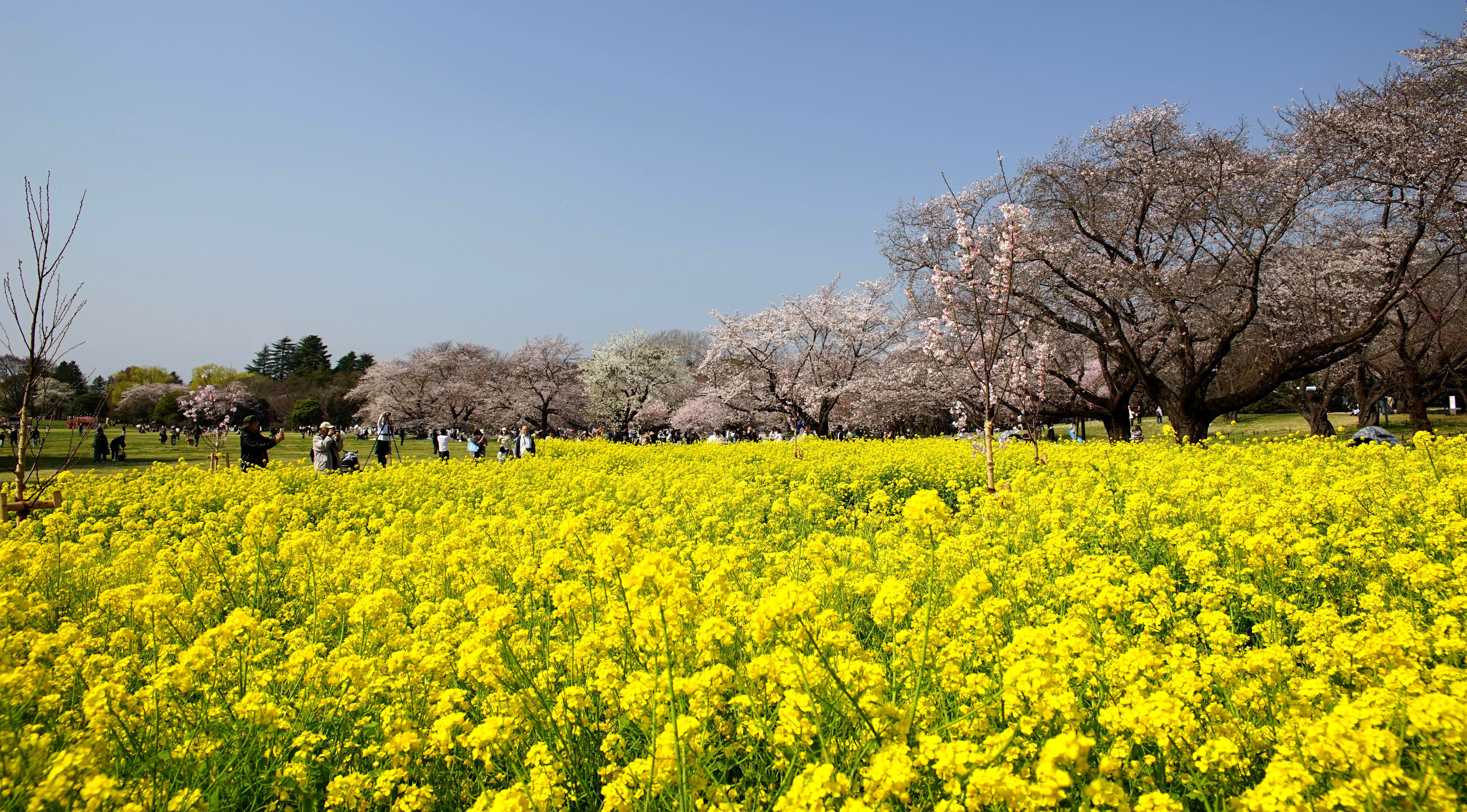 조화롭게 핀 노란 유채꽃과 하얀 벚꽃이 눈을 즐겁게 한다.